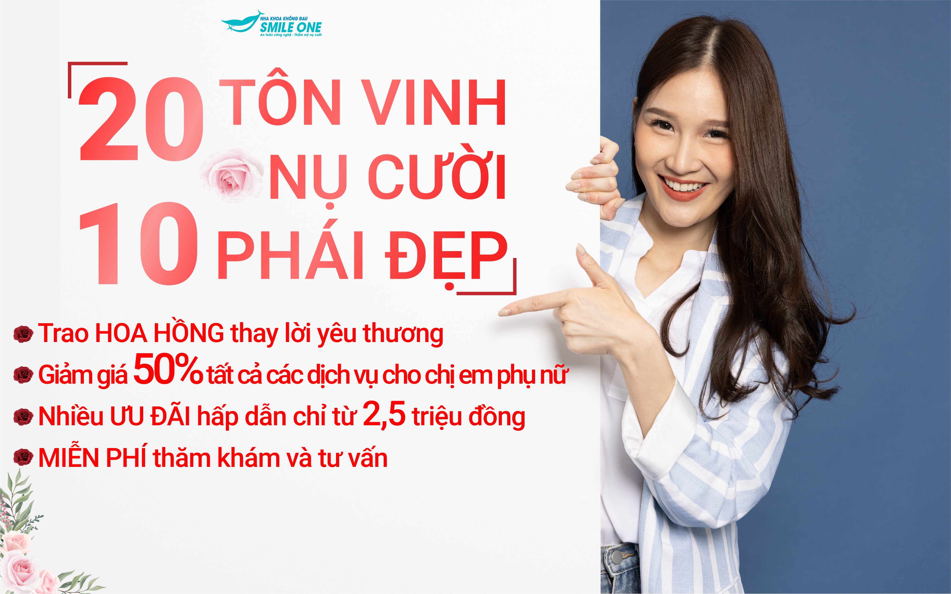 Nhân dịp 20/10 - Ngày Phụ nữ Việt Nam, nha khoa Smile One tổ chức chương trình “Tôn vinh nụ cười phái đẹp” giảm giá, tặng quà tri ân cho phụ nữ khi đến thăm khám và điều trị tại Smile One từ ngày 16/10 - 20/10.
