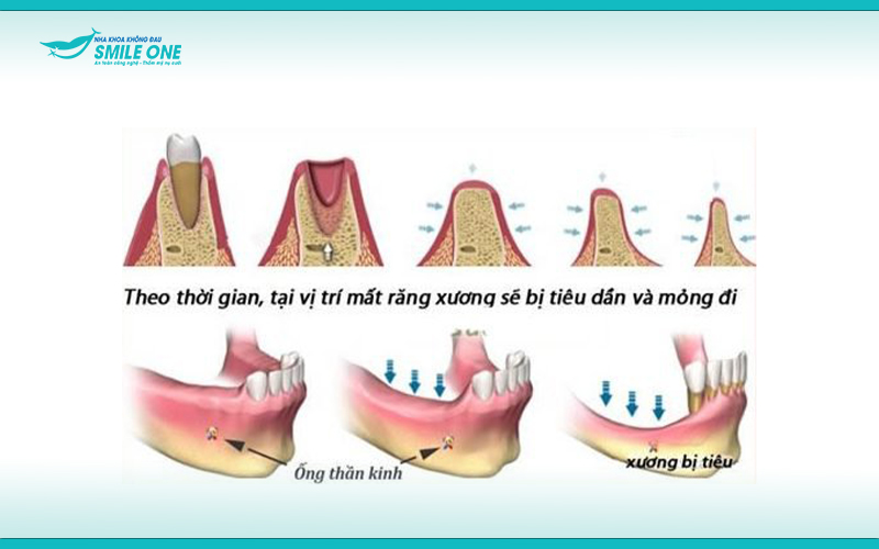 Sau khi bị mất răng, phần xương hàm có thể bị tiêu xương, do mật độ xương tụt dần, mất răng càng lâu thì xương hàm tiêu càng nhiều. Phần xương hàm bị tụt xuống có thể gây ra hiện tượng bị móm và lão hóa sớm.